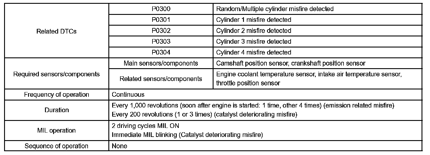 When a misfire occurs in the engine, hydrocarbons (HC) enter the exhaust in high concentrations. If this HC concentration is high enough, there could be an increase in exhaust emissions levels. High concentrations of HC passing through the catalyst also cause to temperature of the catalyst to increase, possibly damaging the catalyst. To prevent this increase in the emissions and limit the possibility of thermal damage, the ECM monitors the misfire rate. When the temperature of the catalyst reaches a point of thermal degradation, the ECM will blink the MIL. For monitoring misfire, the ECM uses both camshaft position sensor and crankshaft position sensor. The camshaft position sensor is used to identify misfiring cylinders and the crankshaft position sensor is used to measure variations in the crankshaft rotation speed. The misfire counter increments when crankshaft rotation speed variations exceed threshold values.