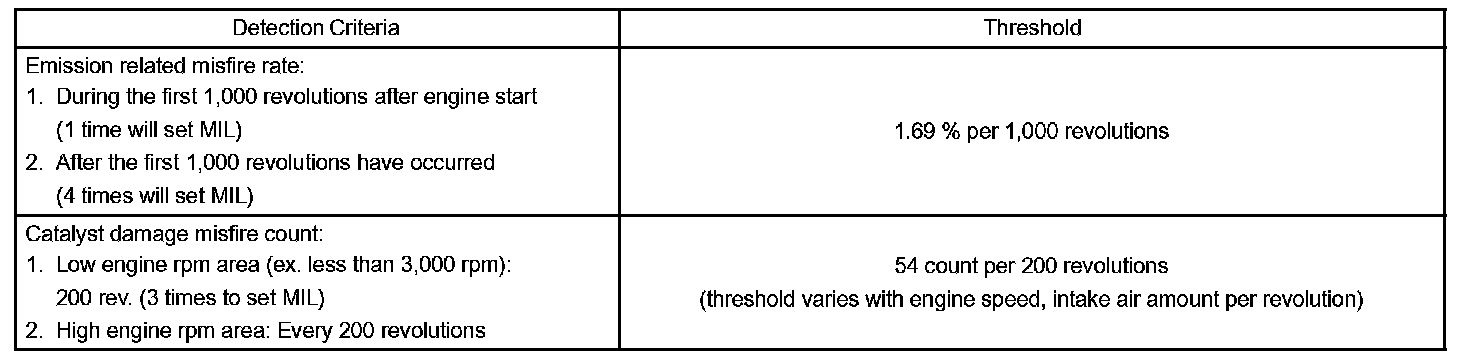 The ECM will illuminate the MIL when the percent misfire exceeds the specified limit per 1,000 engine revolutions. One occurrence of excessive misfire during engine start will set the MIL. Four occurrences are required to set the MIL 1,000 revolutions after engine start. (2 trip detection logic)