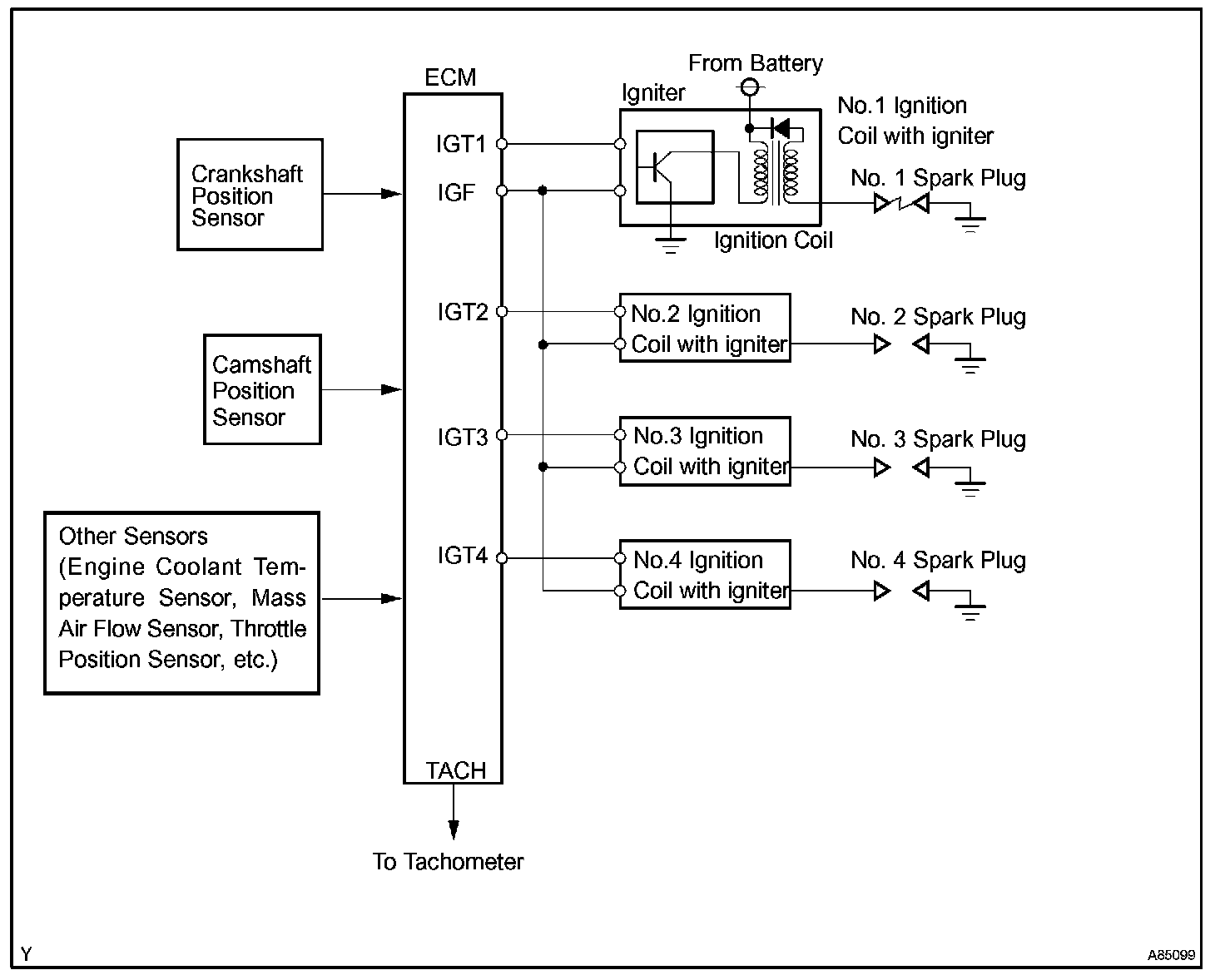 The ECM determines the ignition timing and outputs the ignition (IGT) signals for each cylinder. Using the IGT signal, the ECM turns on and off the power transistor inside the igniter and this switches on and off the current to the primary coil. When the current flow to the primary coil is cut off, high-voltage is generated in the secondary coil and this voltage is applied to the spark plugs to spark inside the cylinders. As the ECM cuts the current to the primary coil, the igniter sends back the ignition confirmation (IGF) signal for each cylinder ignition to the ECM.