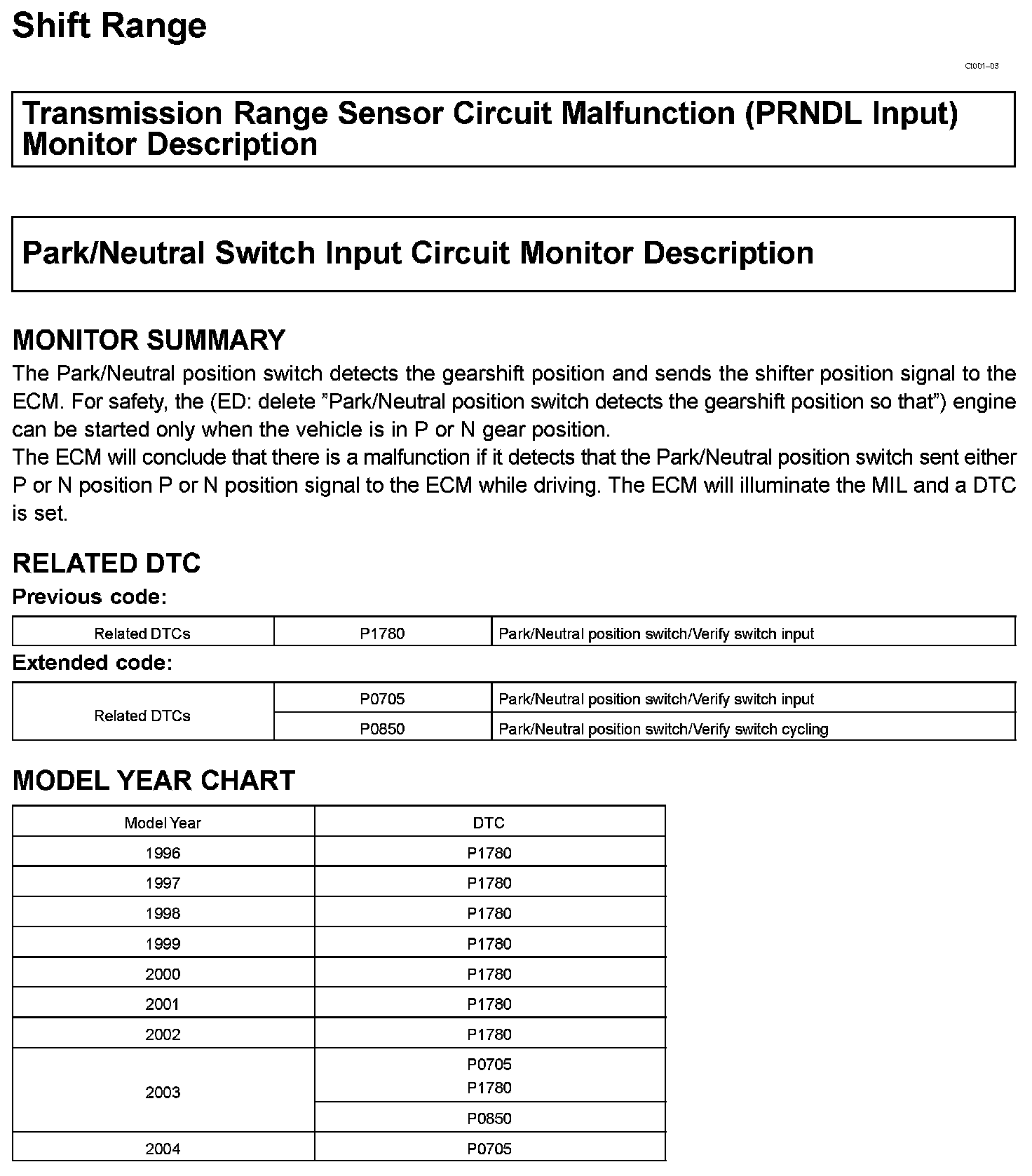 Transmission Range Sensor Circuit Malfunction(PRNDL Input)Monitor Description