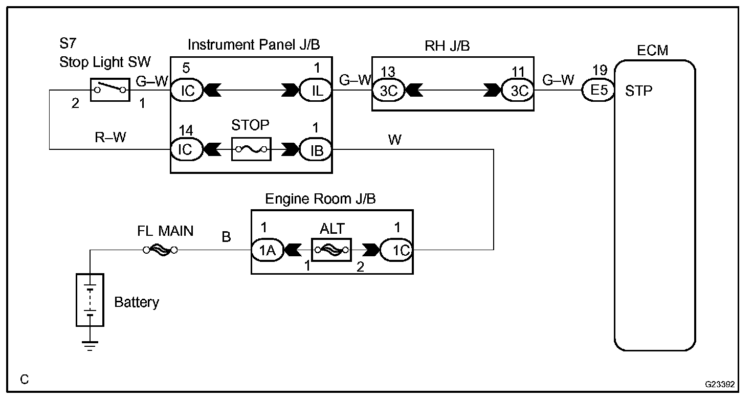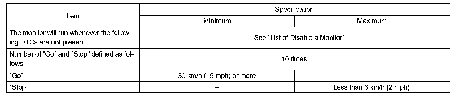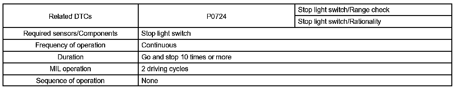 The circuit prevents the engine from stopping when the vehicle is stopped by sudden braking when the torque converter clutch is in the "lock-up" mode. The ECM receives the signal from the stop light switch at the time brake pedal is depressed. Then, the ECM sends the signal to the lock-up solenoid valve not to be in lock-up condition. When the stop light switch remains ON during "stop and go" driving, the ECM interprets this as a fault in the stop light switch and the MIL comes on. The vehicle must stop and go (3 km/h (2 mph) to 30 km/h (19 mph)) ten times for two driving cycles in order to detect malfunction.