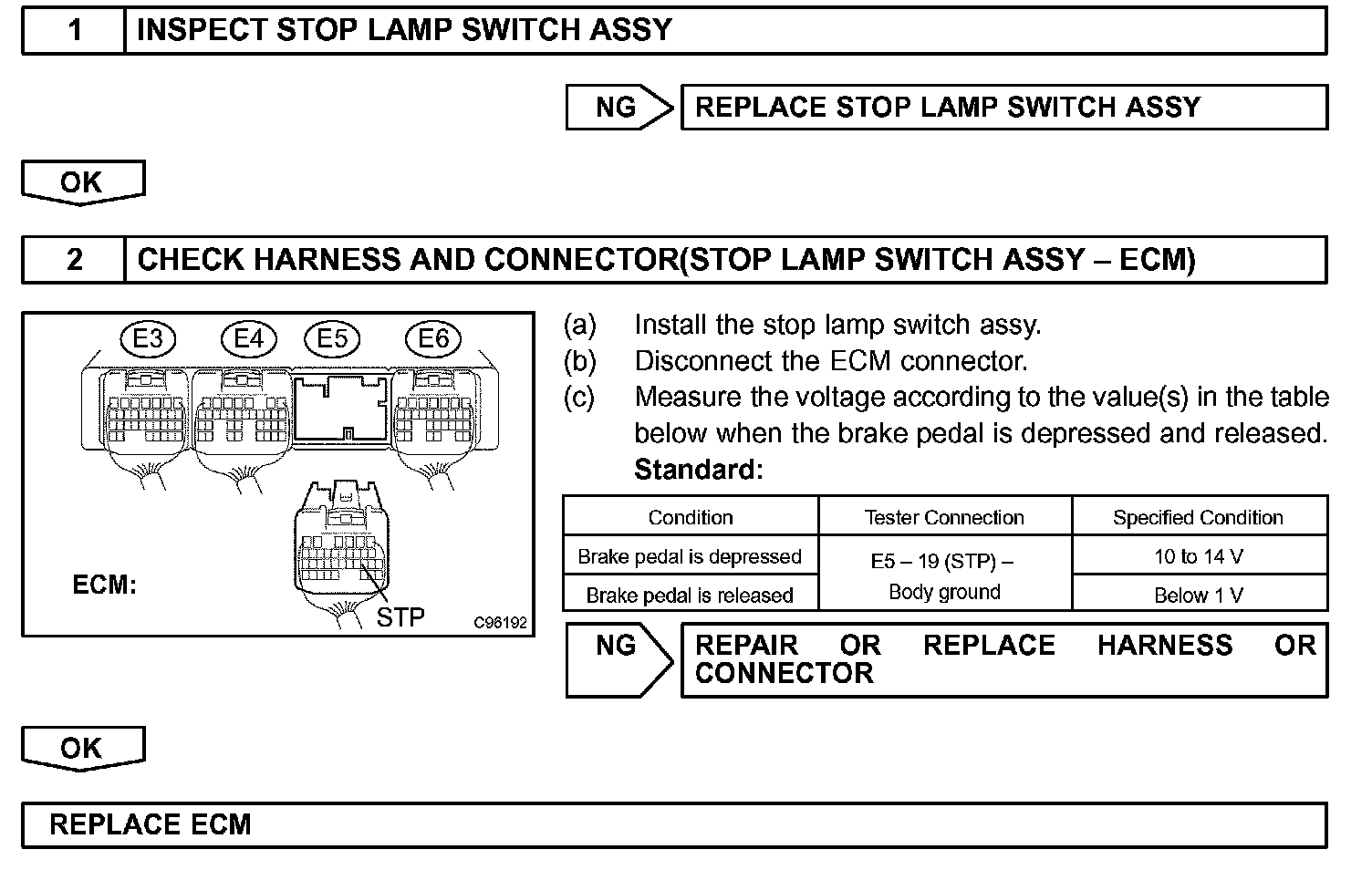 When the brake pedal is depressed, this switch sends a signals to the ECM. Then the ECM cancels the operation of the lock-up clutch while braking is in progress.