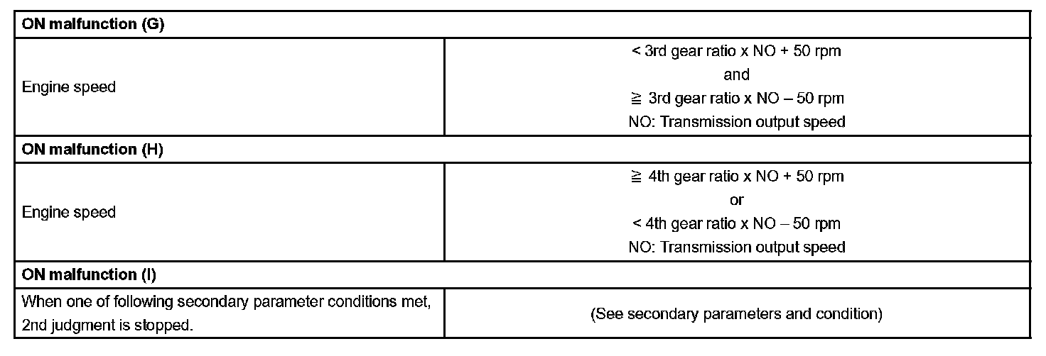 The ECM commands gear shifts by turning the shift solenoid valves "ON/OFF". According to the input shaft revolution, intermediate (counter) shaft revolution and output shaft revolution, the ECM detects the actual gear position (1st, 2nd, 3rd or O/D gear position). When the gear position commanded by the ECM and the actual gear position are not same, the ECM illuminates the MIL.