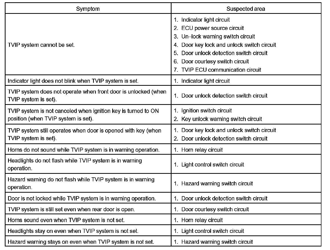 HINT: Troubleshooting of the TVIP system is based on the premise that the door lock control system and wireless door lock control system is operating normally. Accordingly, before troubleshooting the TVIP system, first make certain that the door lock control system and wireless door lock control system is operating normally.