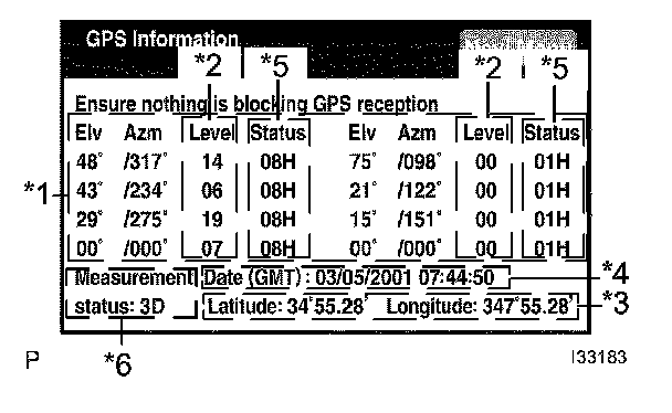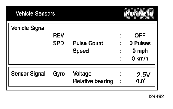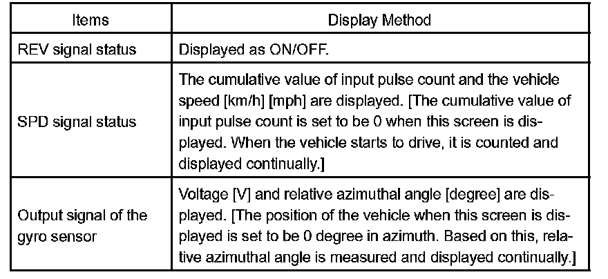 5. Check the vehicle signals (REV, SPD) and the output signal of the gyro sensor introduced into the navigation system.