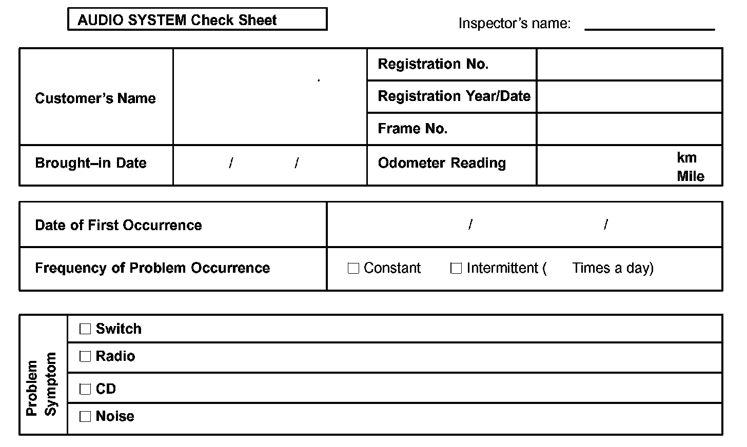 Audio System Check Sheet: