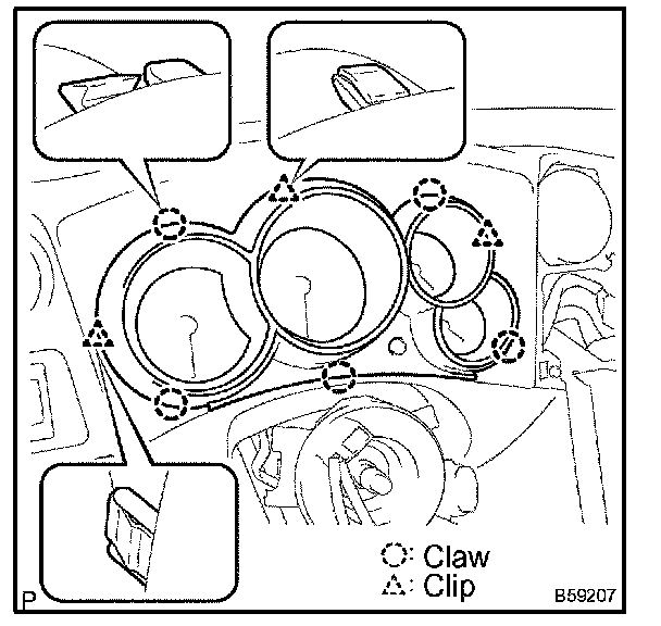 d. Using a moulding remover, disengage the 2 clips and 7 claws, then pull out the instrument cluster finish panel assy CTR.