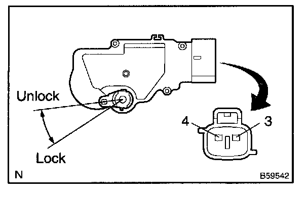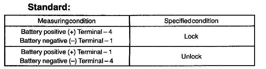 a. Apply battery voltage and inspect the door lock motor operation, as show in the illustration and table.