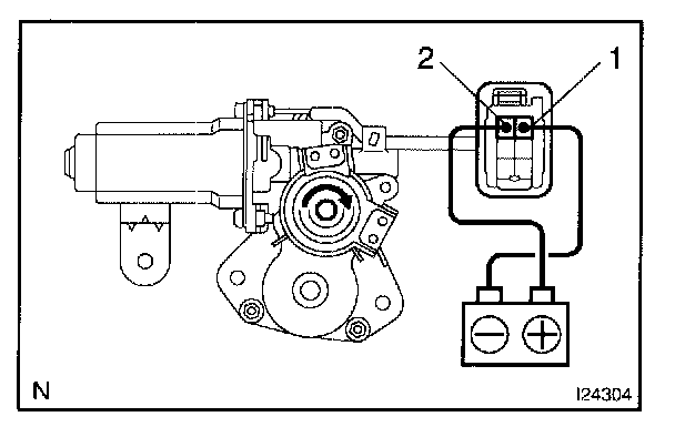 a. Connect the positive (+) lead from the battery to terminal 2 and the negative (-) lead to terminal 1, and check that the motor turns clockwise (moves to the close side).
