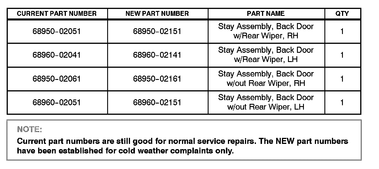 Some customers may complain that the rear hatch may be slow to open by itself in extremely cold weather. New parts information and repair procedures have been provided to address this condition. All other repairs should continue to use original service parts.