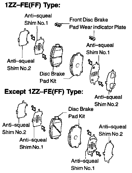 c. 1ZZ-FE(FF) type: Install the pad wear indicator plate facing upward, and install each pad.