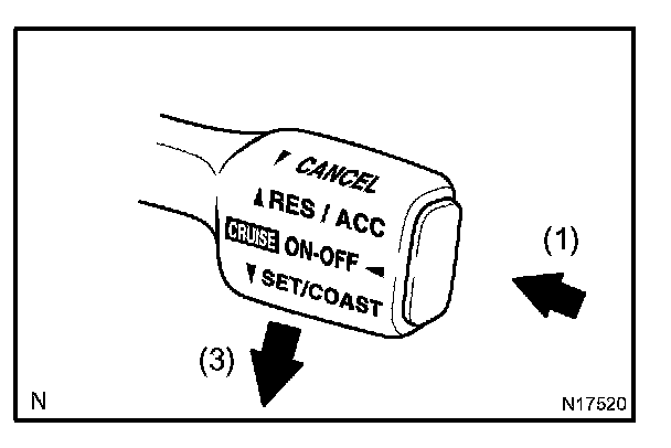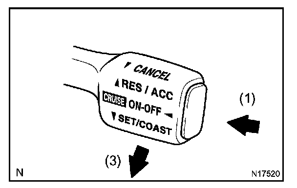 3. Check that the vehicle speed is decreases while the cruise control main switch assy is push down to SET/COAST, and the vehicle cruises at the set speed when the switch is released.