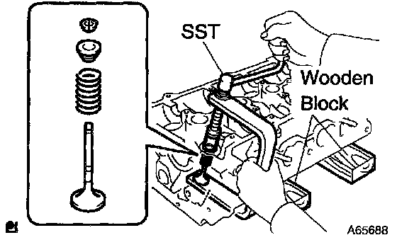 b. Using SST, compress the inner compression spring and remove the 2 valve spring retainer locks.