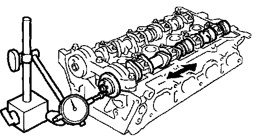 b. Using a dial indicator, measure the thrust clearance while moving the camshaft back and forth.