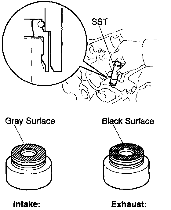 HINT: The intake valve stem oil seal is gray and exhaust valve stem oil seal is black.