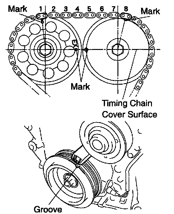 a. Turn the crankshaft pulley, and align its groove with timing mark "0" of the timing chain cover.