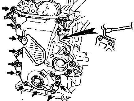 c. Remove the timing chain cover by prying the portions between the cylinder head and cylinder block with a screw driver.