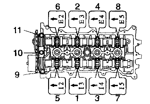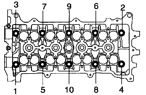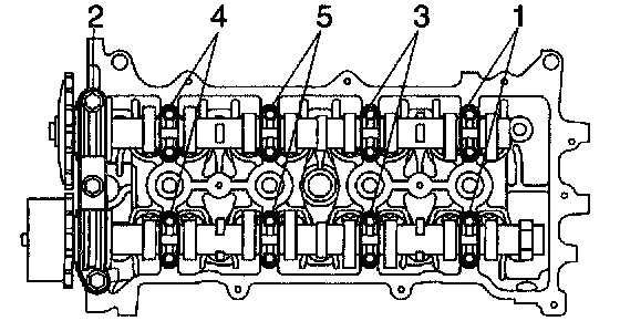 a. Uniformly loosen and remove the 19 bearing cap bolts, in several passes, in the sequence shown, and remove the 9 bearing caps, intake and exhaust camshafts.