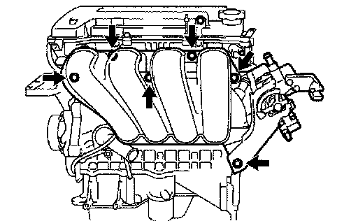 c. Remove the 4 bolts, 2 nuts, 2 wire brackets, the intake manifold and throttle body assembly.