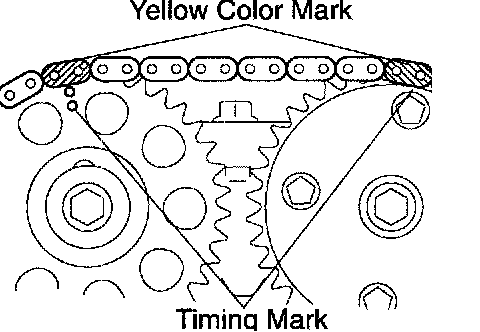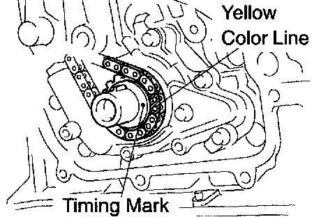 b. Install the timing chain on the crankshaft timing sprocket with the yellow color link aligned with the timing mark on the crankshaft timing sprocket.
