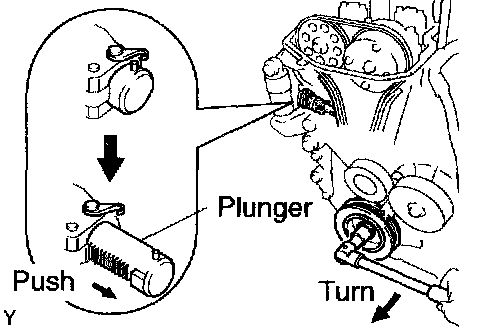 HINT: If the plunger does not spring out, press the slipper into the chain tensioner with a screwdriver so that the hook is released from the knock pin and the plunger springs out.
