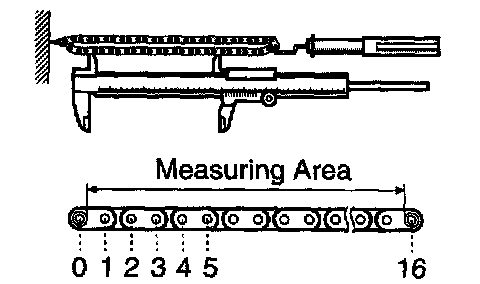 NOTICE: Vernier calipers must contact the chain rollers for the measuring.