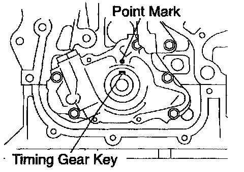 2 Using a crankshaft pulley bolt, turn the crankshaft, and the timing gear key aligned with the point mark on the oil pump.