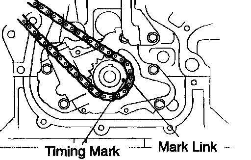 b. Install the chain on the crankshaft timing gear with the yellow color mark link aligned with the timing mark on the crankshaft timing gear.