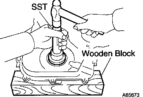 c. Using SST, tap in the oil seal until its surface is flush with the timing chain cover edge.