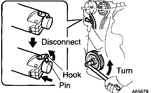 4 Turn the crankshaft counterclockwise, and disconnect the plunger knock pin from the hook.