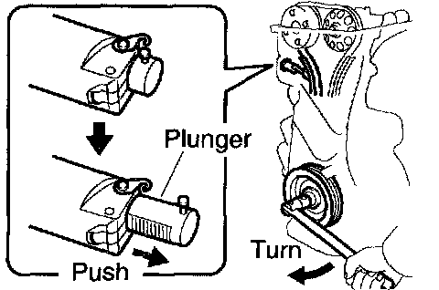 HINT: If the plunger does not spring out, press the slipper into the chain tensioner with a screwdriver so that the hook is released from the knock pin and the plunger springs out.
