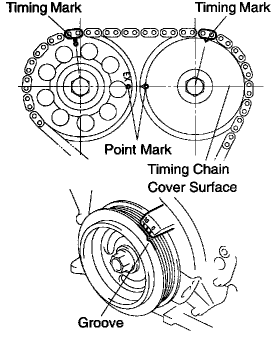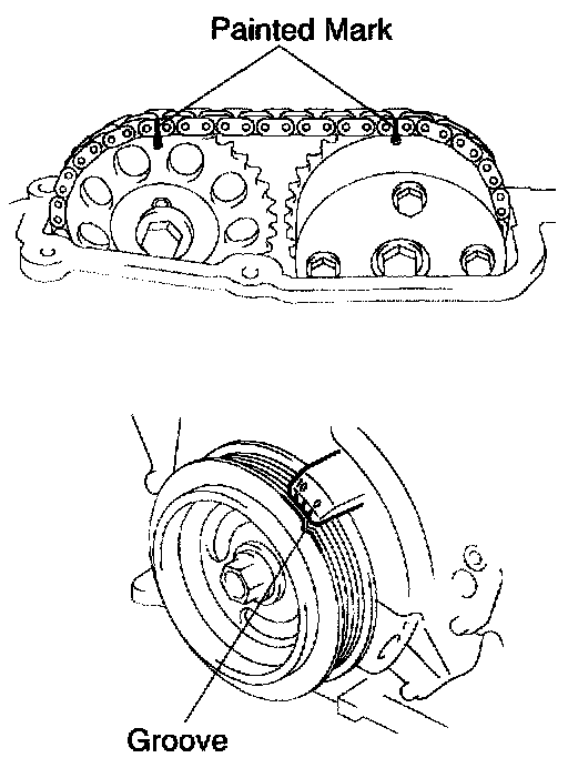 s. Check the painted marks on the chain and camshaft timing gears, and then the alignment of the crankshaft pulley groove with timing mark of the timing chain cover as shown in the illustration.