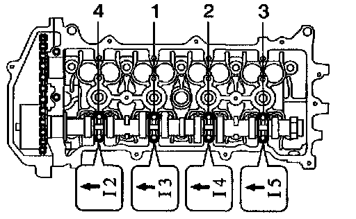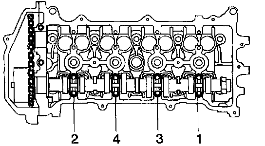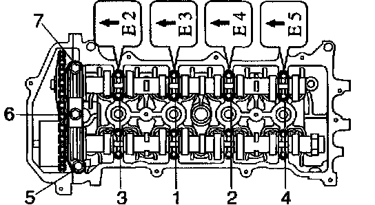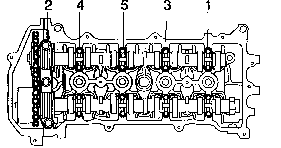 g. Loosen the bearing cap bolts on camshaft in the order as shown in the illustration in several passes, and remove the bearing caps.