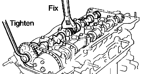 d. Fix the camshaft with a spanner and so on, then loosen the camshaft timing gear set bolt.