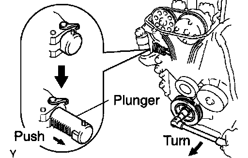 HINT: If the plunger does not spring out, press the slipper into the chain tensioner with a screwdriver so that the hook is released from the knock pin and the plunger springs out.