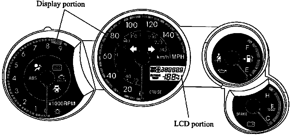 COMBINATION METER^ The dial portion of the optitron display type combination meter has been arranged into a belt shape. The lettering has been changed from italics to normal and its color has been changed from red to white. Thus, the meter realizes a sportier image.