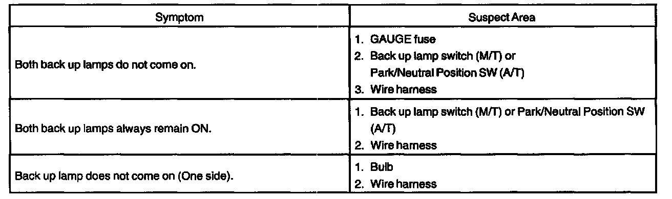Problem Symptoms Table - Back Up Lamp: