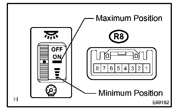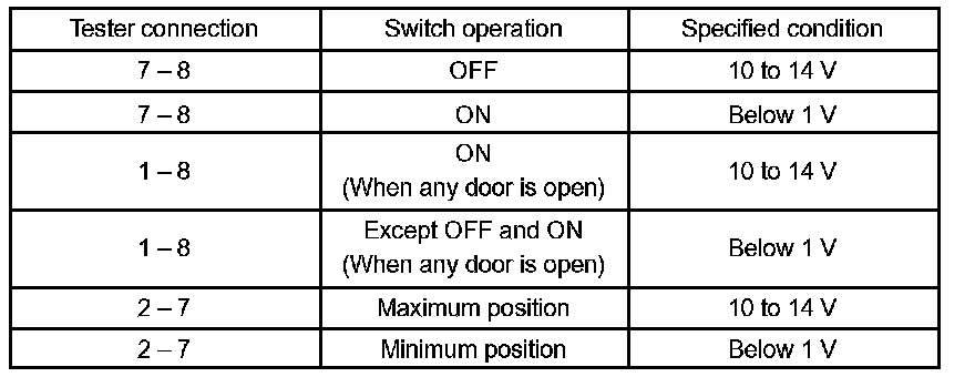 (a) Connect the connector to the rheostat and inspect the wire harness side connector from the back side as shown in the table provided.