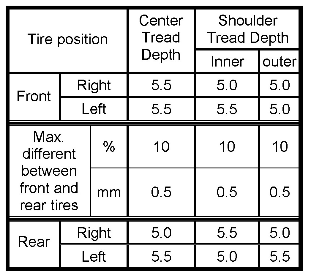 3. If one or both tires have equal or more than (20% or 1 mm) difference between the center front and rear tires, rotate the tires.