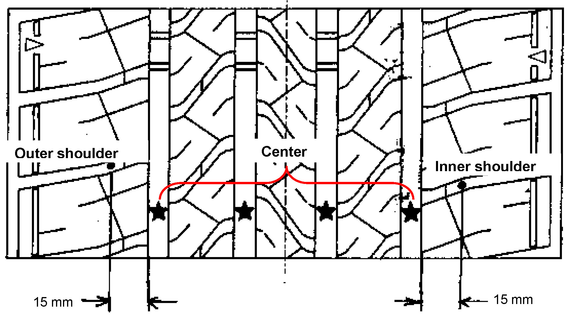 4. Measure the inner and outer tire shoulder tread depth. (See diagram)