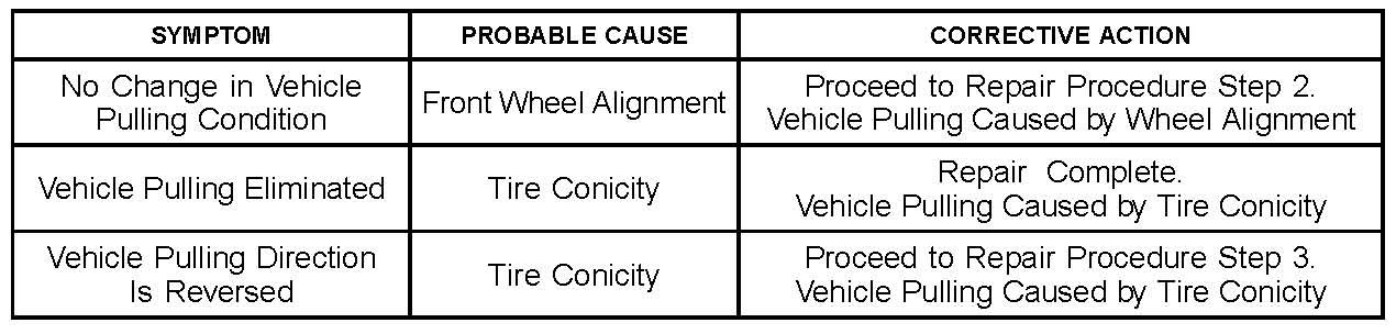 - If the pulling direction does not change after the front tires are switched the cause of vehicle pulling is not tire conicity. In this case the likely cause is a front wheel alignment condition.