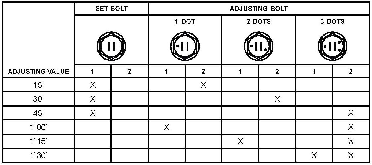 NOTE: Adjusting value for the set bolts is 6' - 30' (0.1° - 0.5°). When making an adjustment of more than 45' replace the upper and lower steering knuckle set bolts with the adjusting bolts. If the camber is NOT within the specification, use the table shown to estimate how much additional camber adjustment will be required, and select the appropriate camber adjusting bolt.