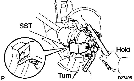 b. Using a hammer handle or an equivalent to hold the hub sub-assy LH, install the LH hub bolt by tightening the nut.