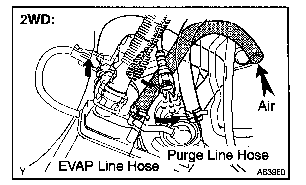 a. Disconnect the purge line hose and EVAP line hose from the charcoal canister.