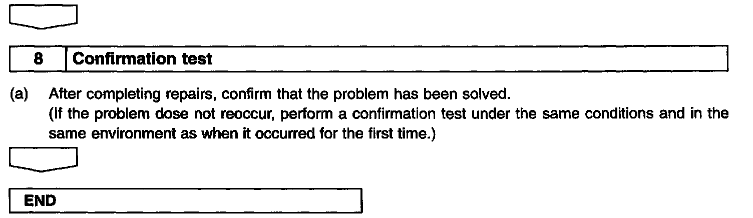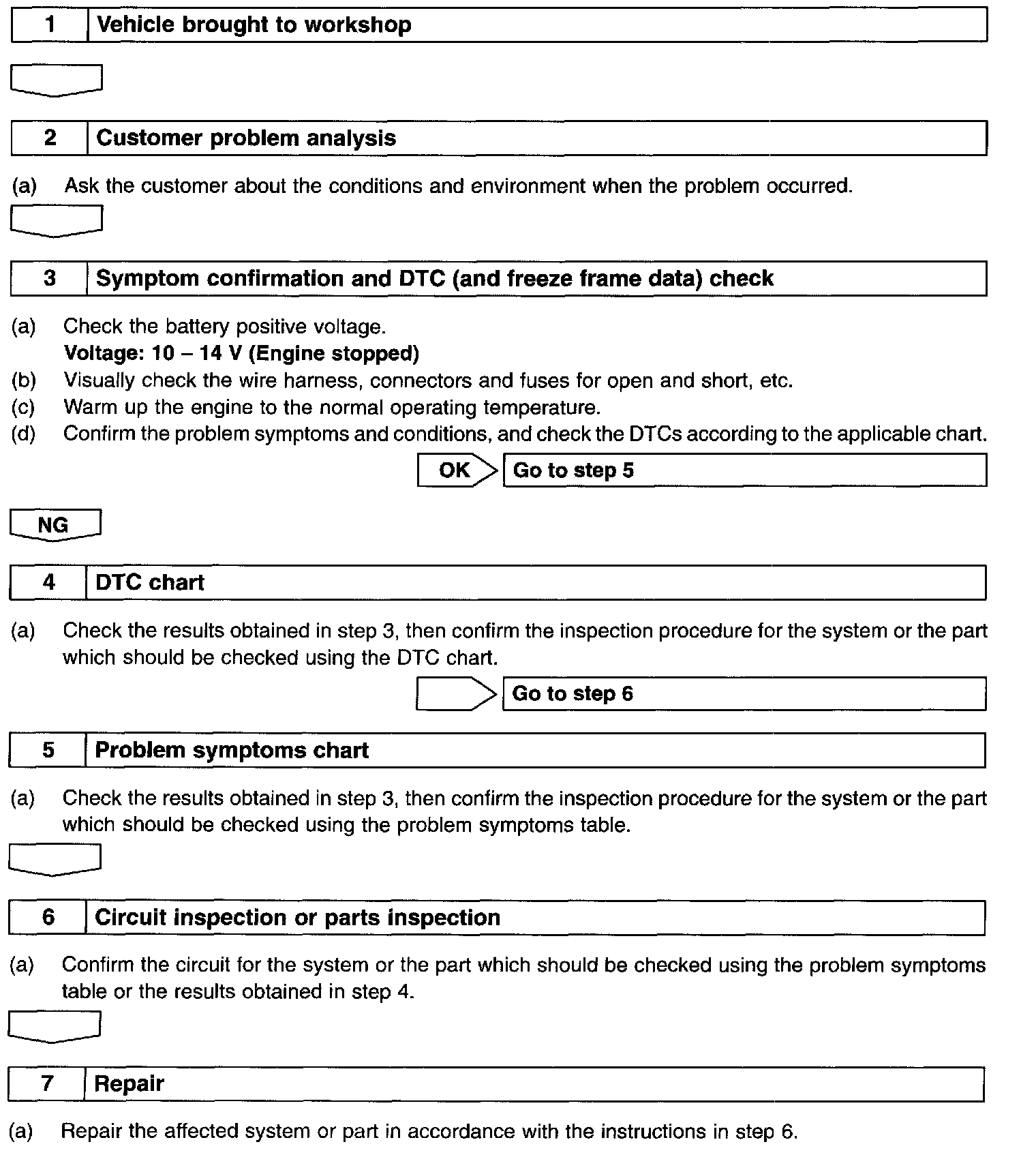 HINT: Carry out a troubleshooting in accordance with the procedure. Here, only the basic procedure is shown. Details are provided in the applicable diagnostics section, showing the most effective methods for each circuit. Confirm the troubleshooting procedures first for the relevant circuit before beginning the troubleshooting of that circuit.