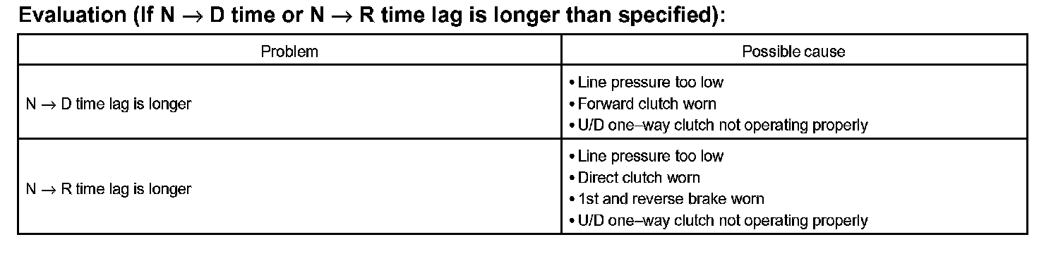 When the shift lever is shifted while the engine is idling, there will be a certain time lapse or lag before the shock can be felt. This is used for checking the conditions of the direct clutch, forward clutch, and 1st and reverse brake.