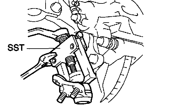 b. Using SST, remove the lower ball joint assy from the steering knuckle LH.