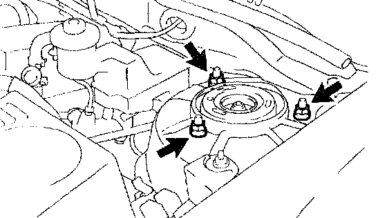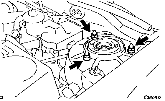 b. Remove the 3 nuts on the upper side of the shock absorber assy front LH. Remove the front shock absorber with the coil spring.