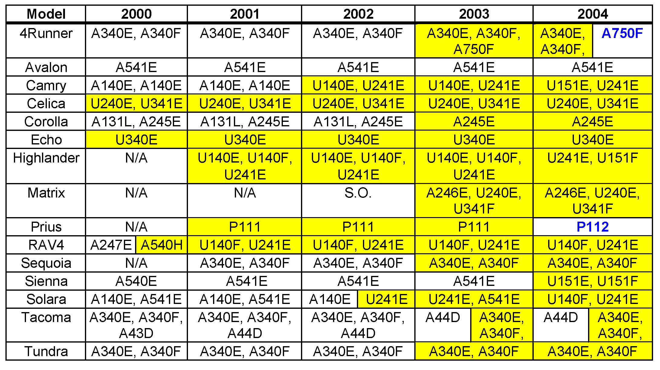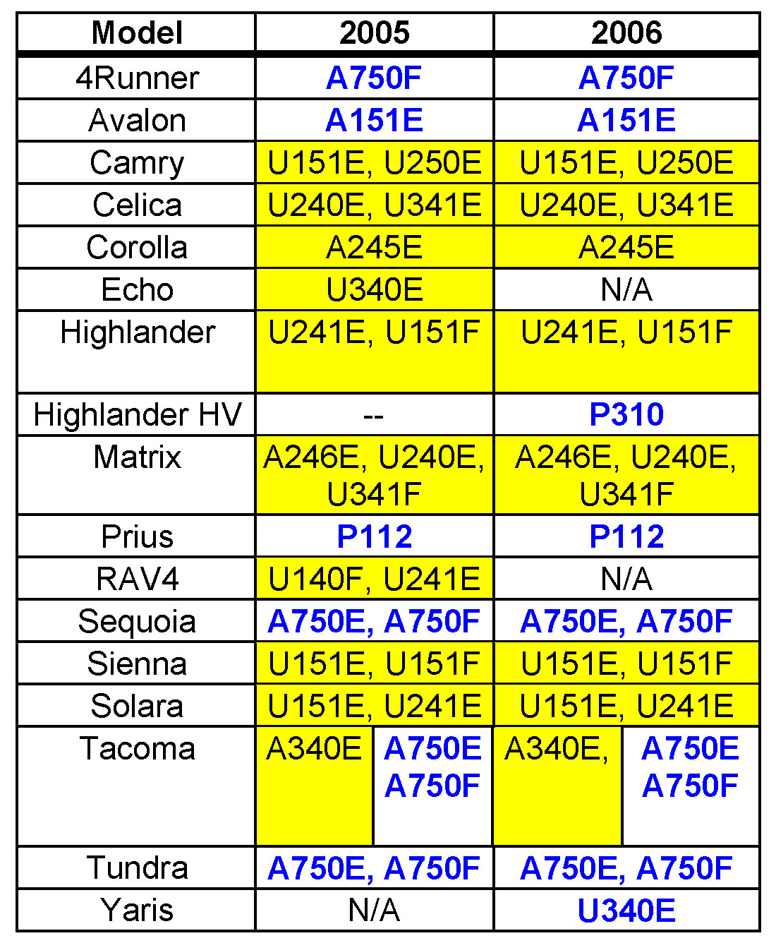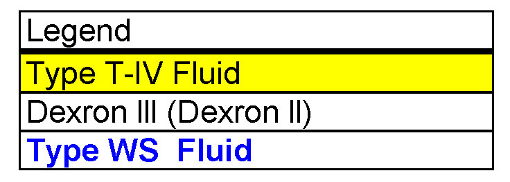 Please refer to the table for correct application of Dexron III or (Dexron II), T-IV and WS Toyota Type Automatic Transmission Fluids.