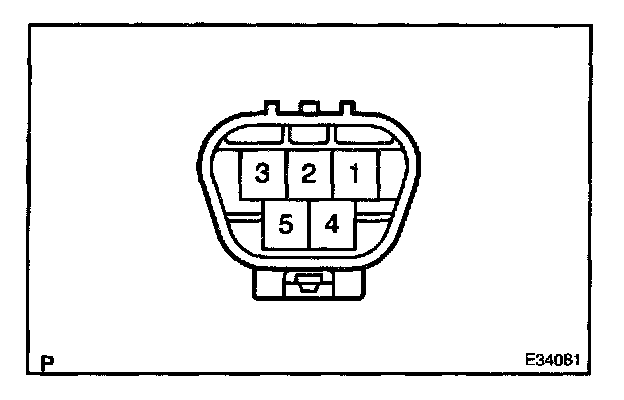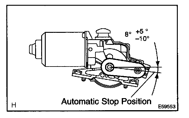 1. Connect the battery (+) to terminal 1 (+1) of the connector, the battery (-) to terminal 5 (E) of the connector. With the motor being rotated at low speed (LO), disconnect terminal 1 (+1) to stop the wiper motor operation at any position except the automatic stop position.